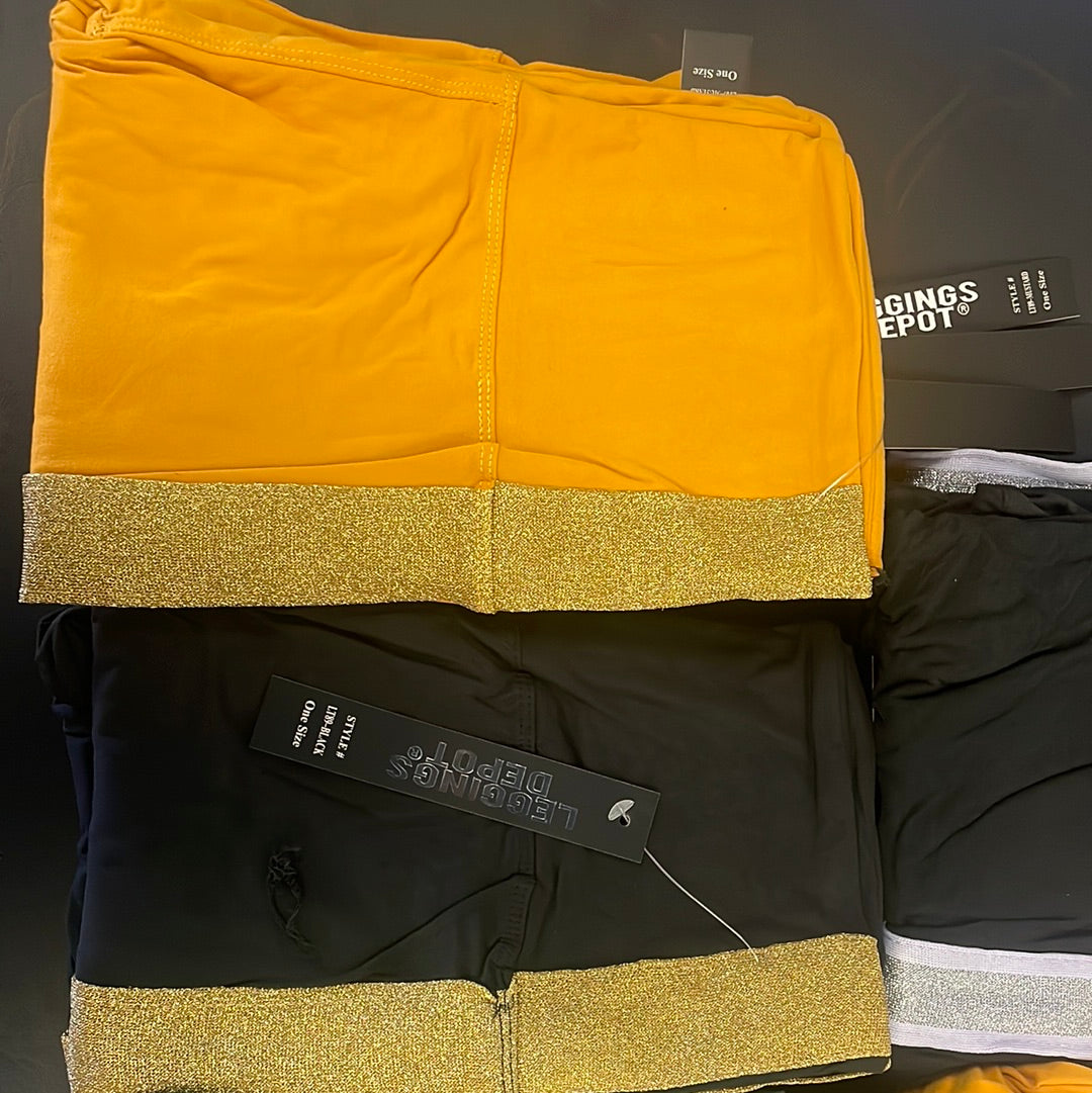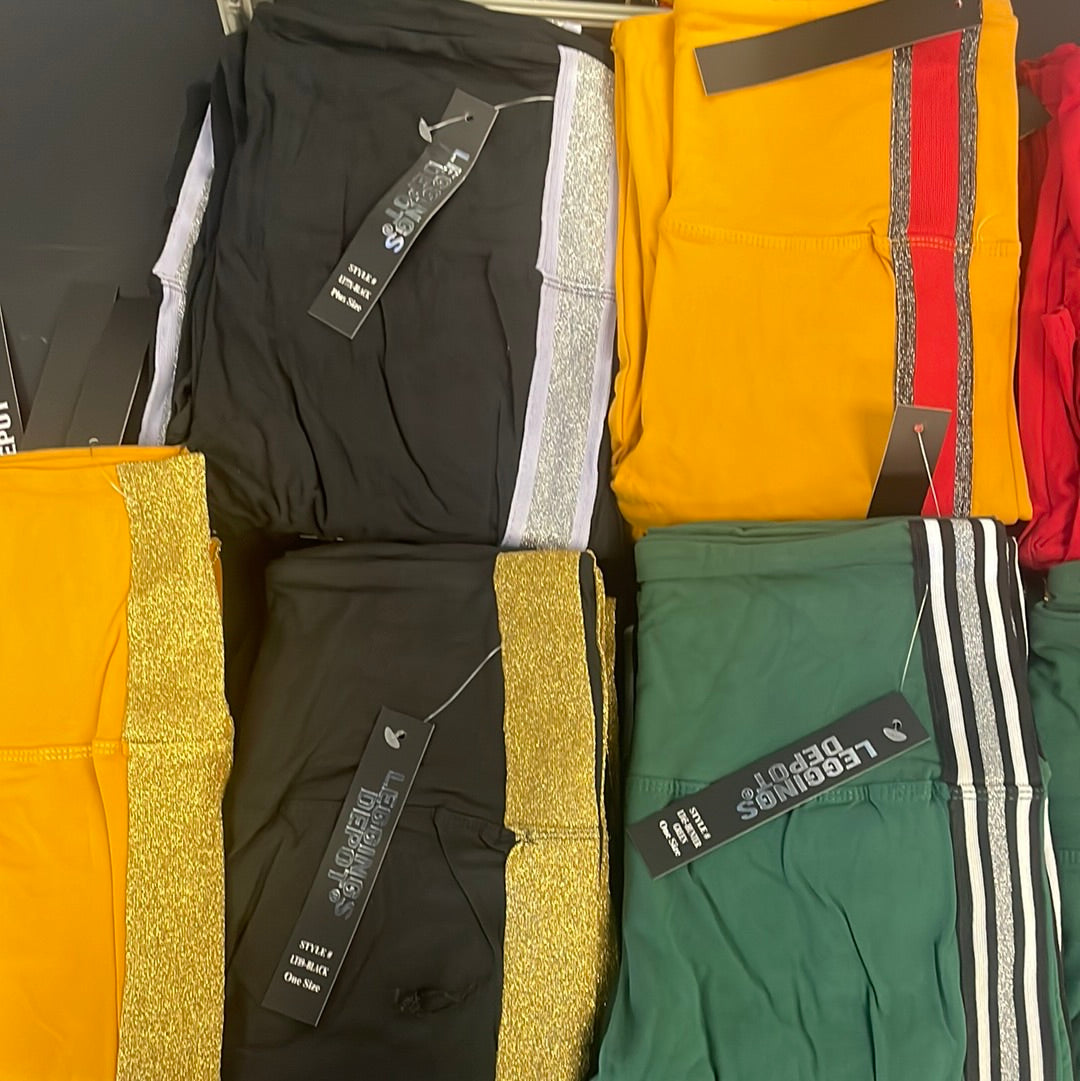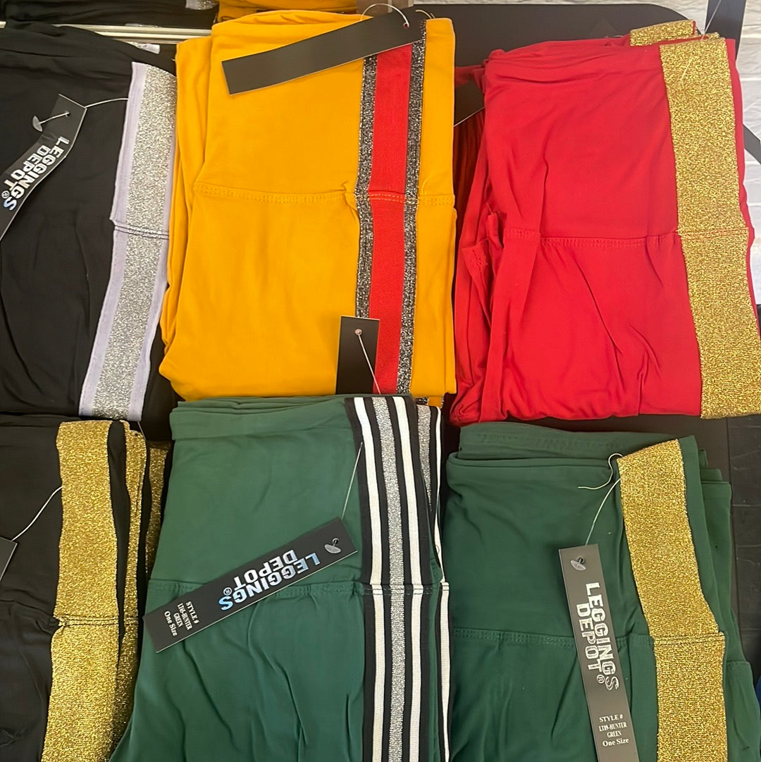 5 inch long yoga style banded solid high waisted leggings . stylishly fitted, With an elastic waist and racing side stripes